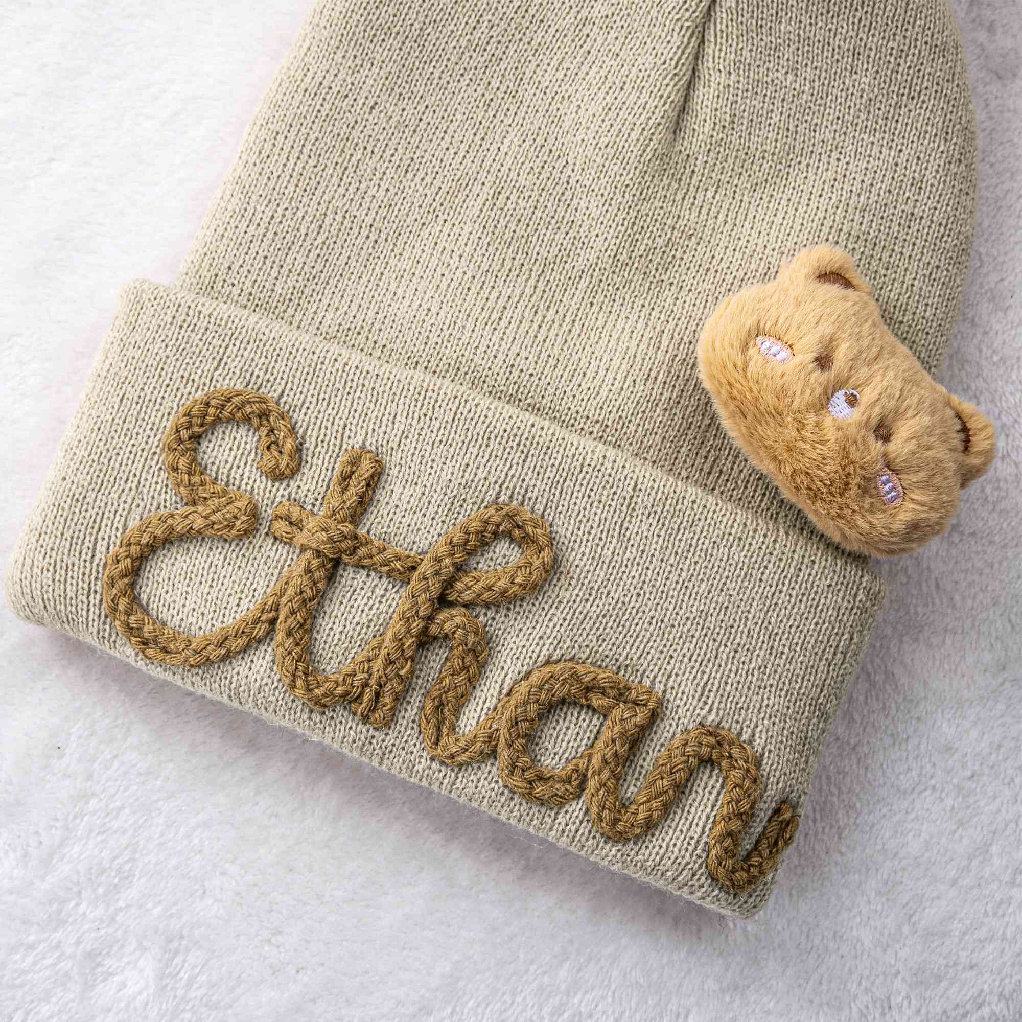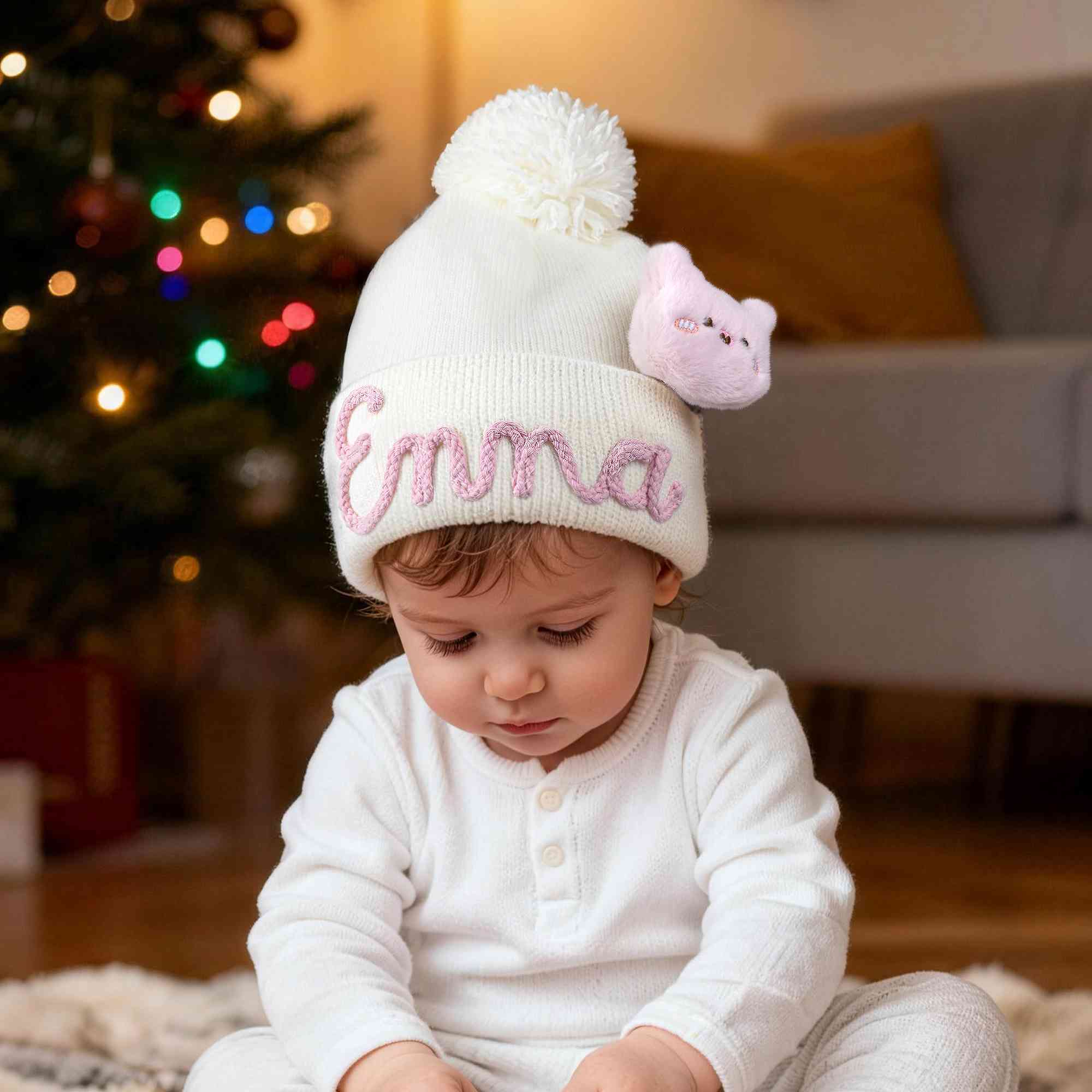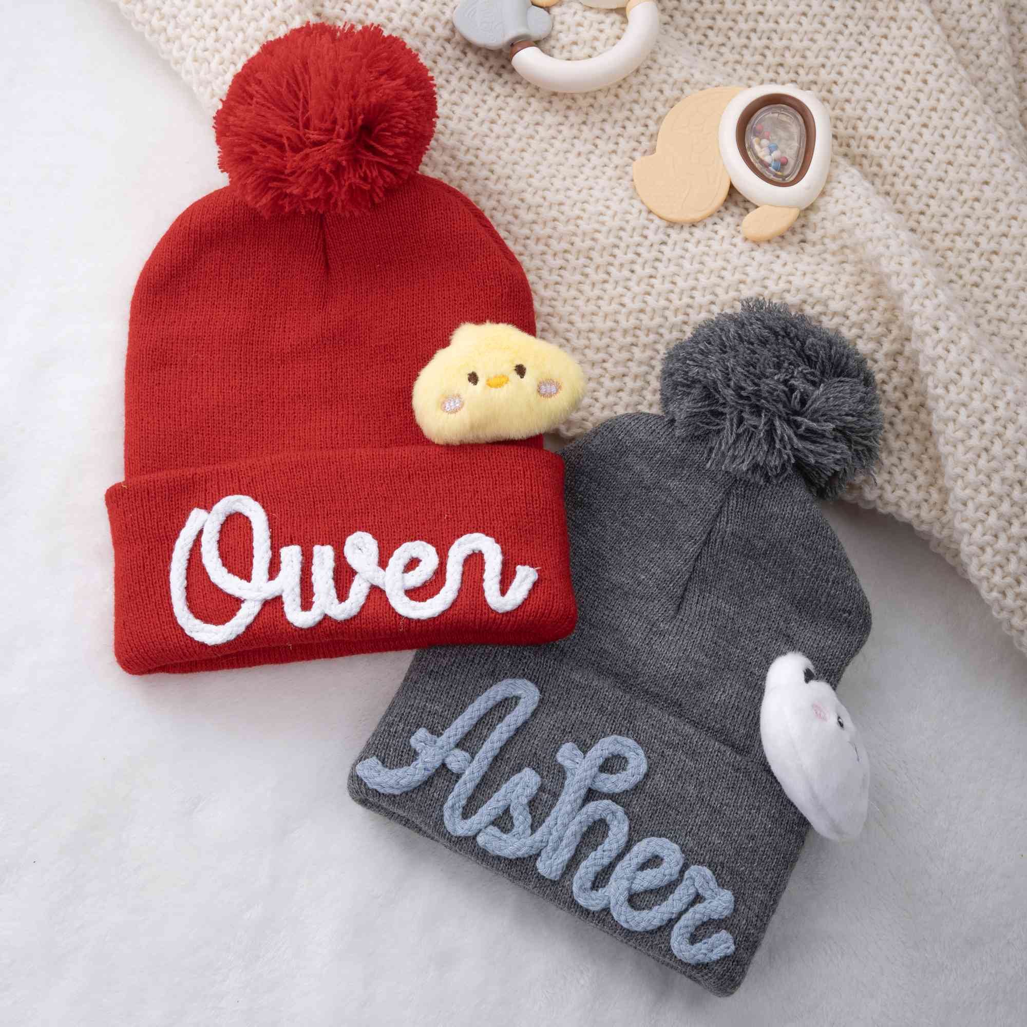 Custom Baby Knit Hat with Yarn Name, Winter Beanie with Animal Accessory, Warm Hat with Pom Pom, Easter/Baby Shower/Birthday Gift for Newborn/Kids