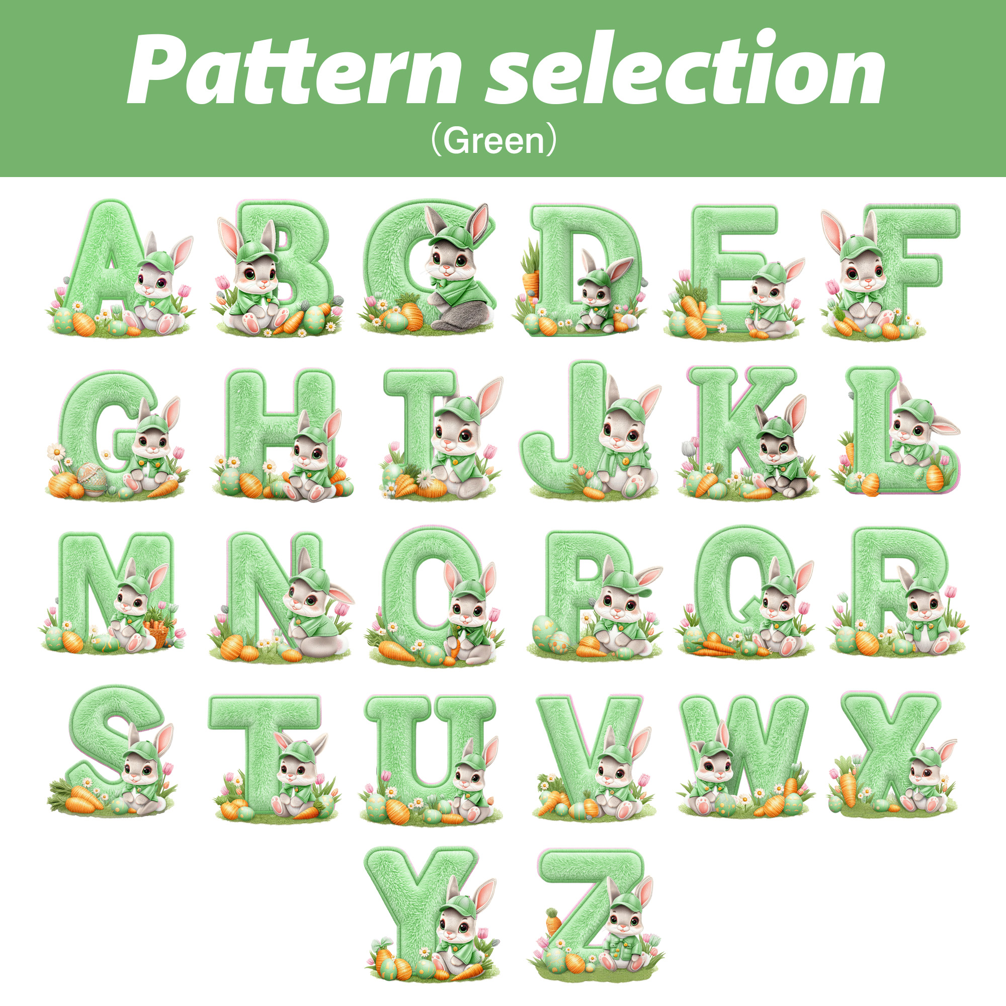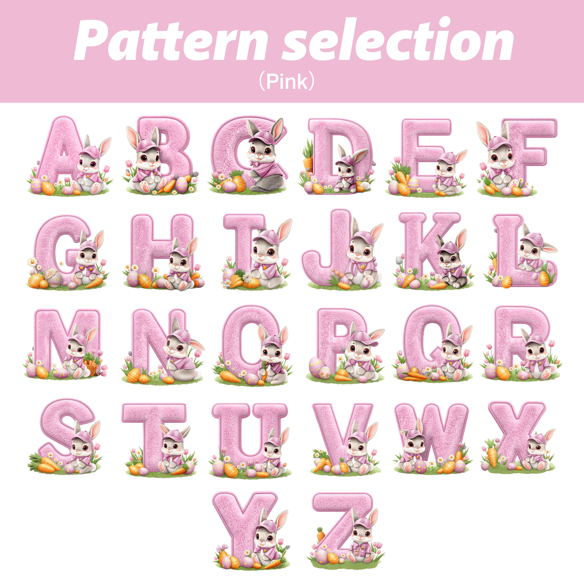 Floral Alphabet Rabbit Design – This plush bunny features a sweet floral alphabet pattern with a charming bow that brings a soft, storybook feel to your child’s room. A gentle cartoon rabbit sits beside a pastel-hued letter, surrounded by spring blossoms and tiny Easter eggs, creating a warm, whimsical look little ones instantly love.