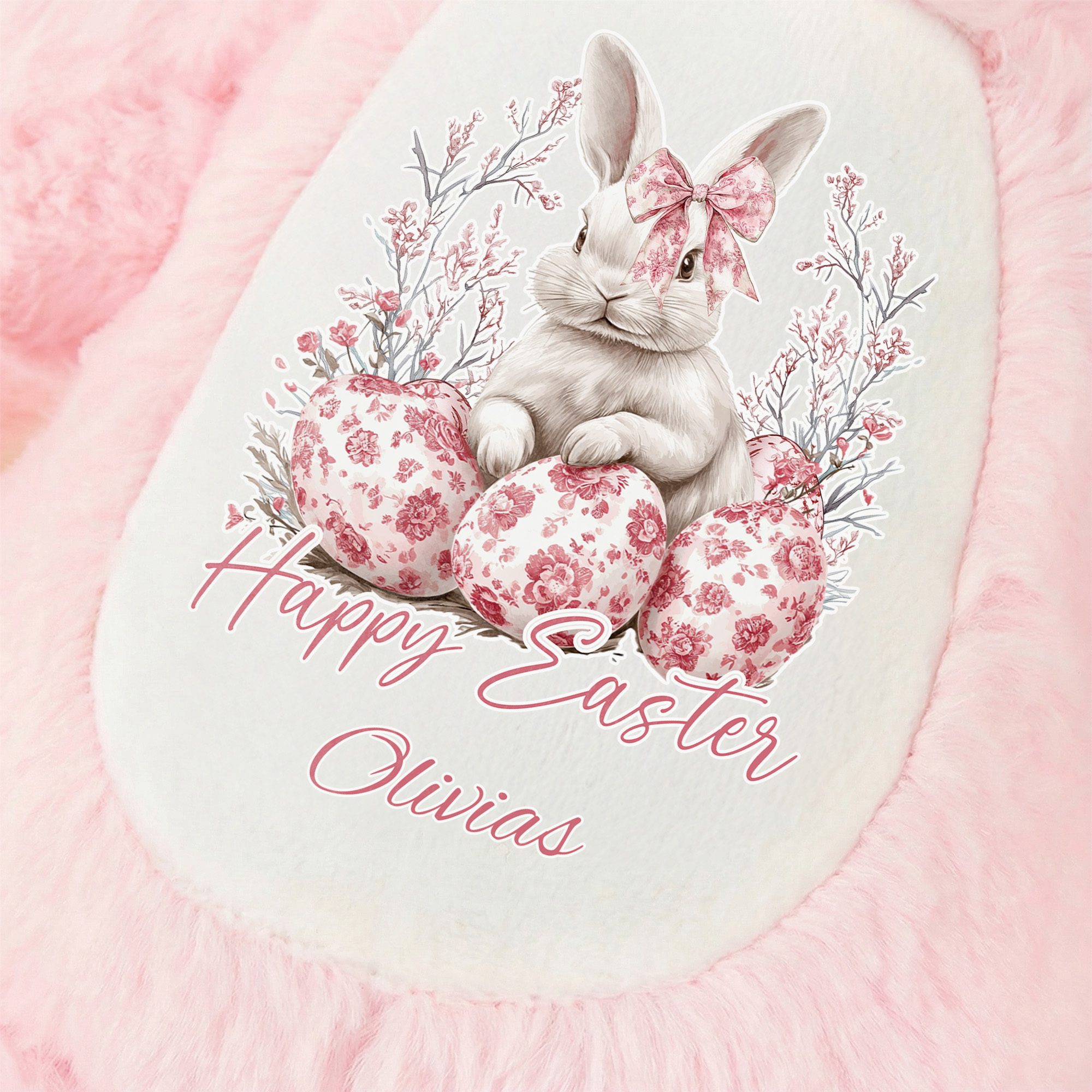 Toile de Jouy Bunny & Eggs Design – This plush bunny features a sweet illustrated scene printed on its belly: a gentle rabbit wearing a delicate bow, surrounded by floral branches and patterned Easter eggs in soft pastel tones. Rendered in classic Toile de Jouy style, the print brings timeless charm and springtime warmth to this cuddly companion.