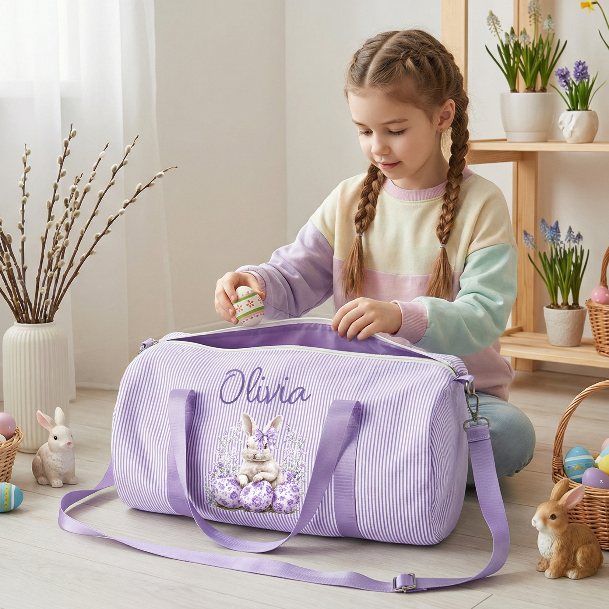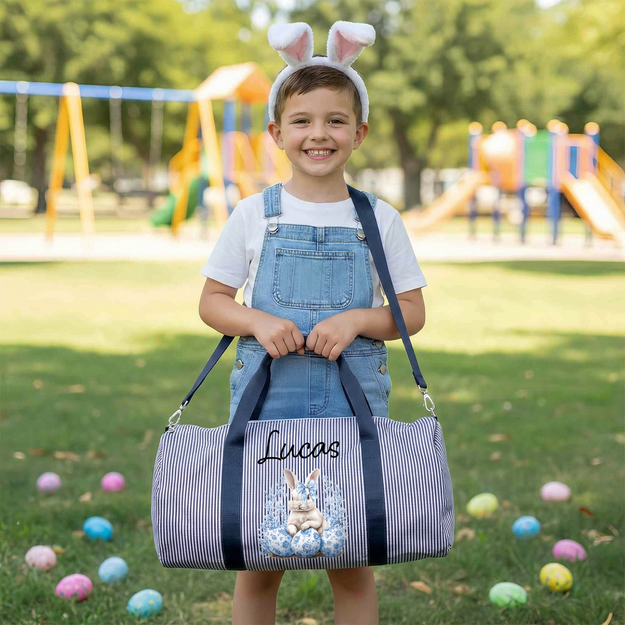• Personalized Name Easter Toile de Jouy Bow Bunny & Eggs Striped Duffle Bag, Children's Overnight Travel Bag, Easter/Birthday Gift for Kids/Boys/Girls
