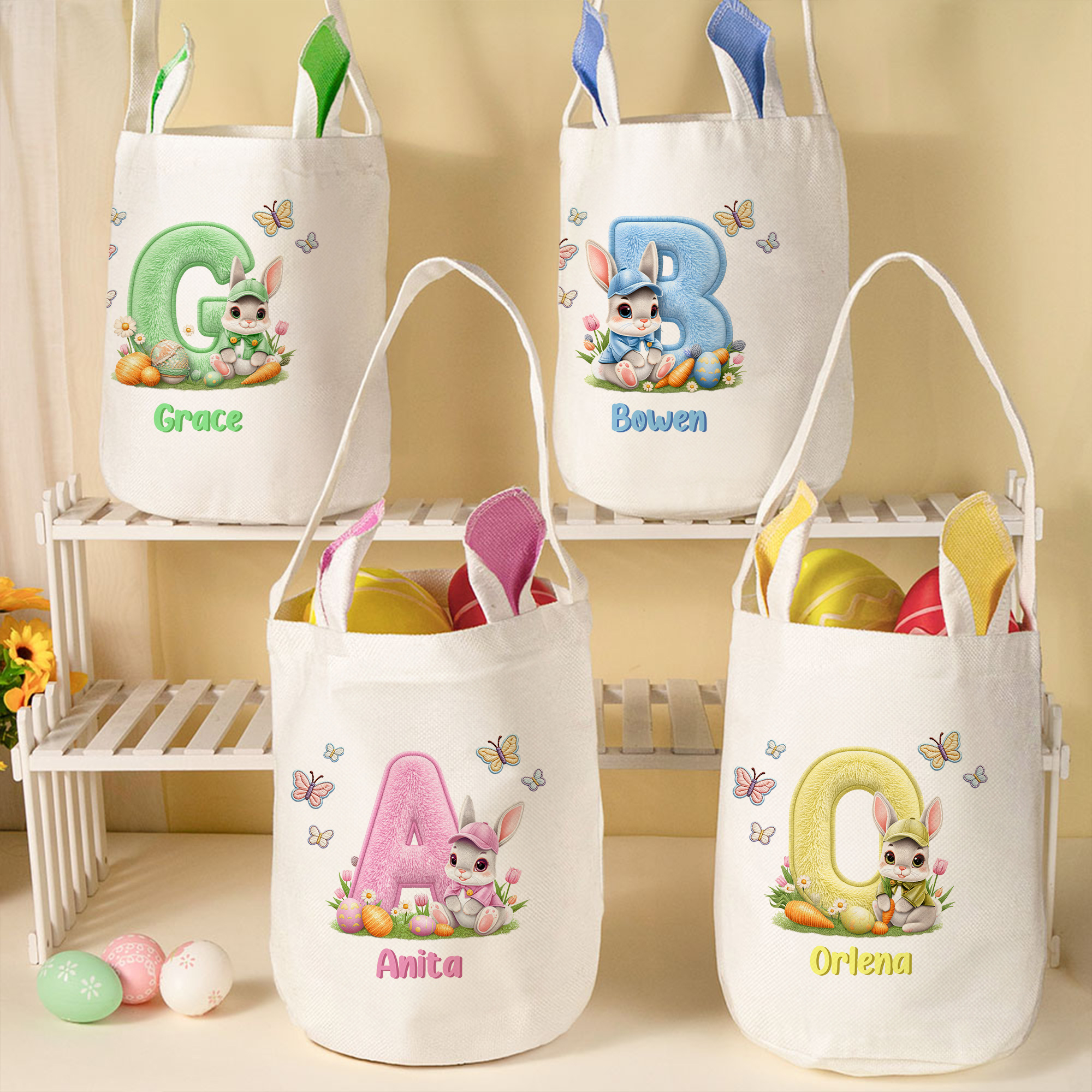 Floral Bunny Alphabet Design – This Easter basket features a sweet cartoon bunny sitting beside a large, colorful alphabet letter in soft pastel tones. The bunny is dressed in a festive hat and surrounded by spring flowers, carrots, Easter eggs, and fluttering butterflies—creating a joyful, nature-inspired scene that celebrates the season.
