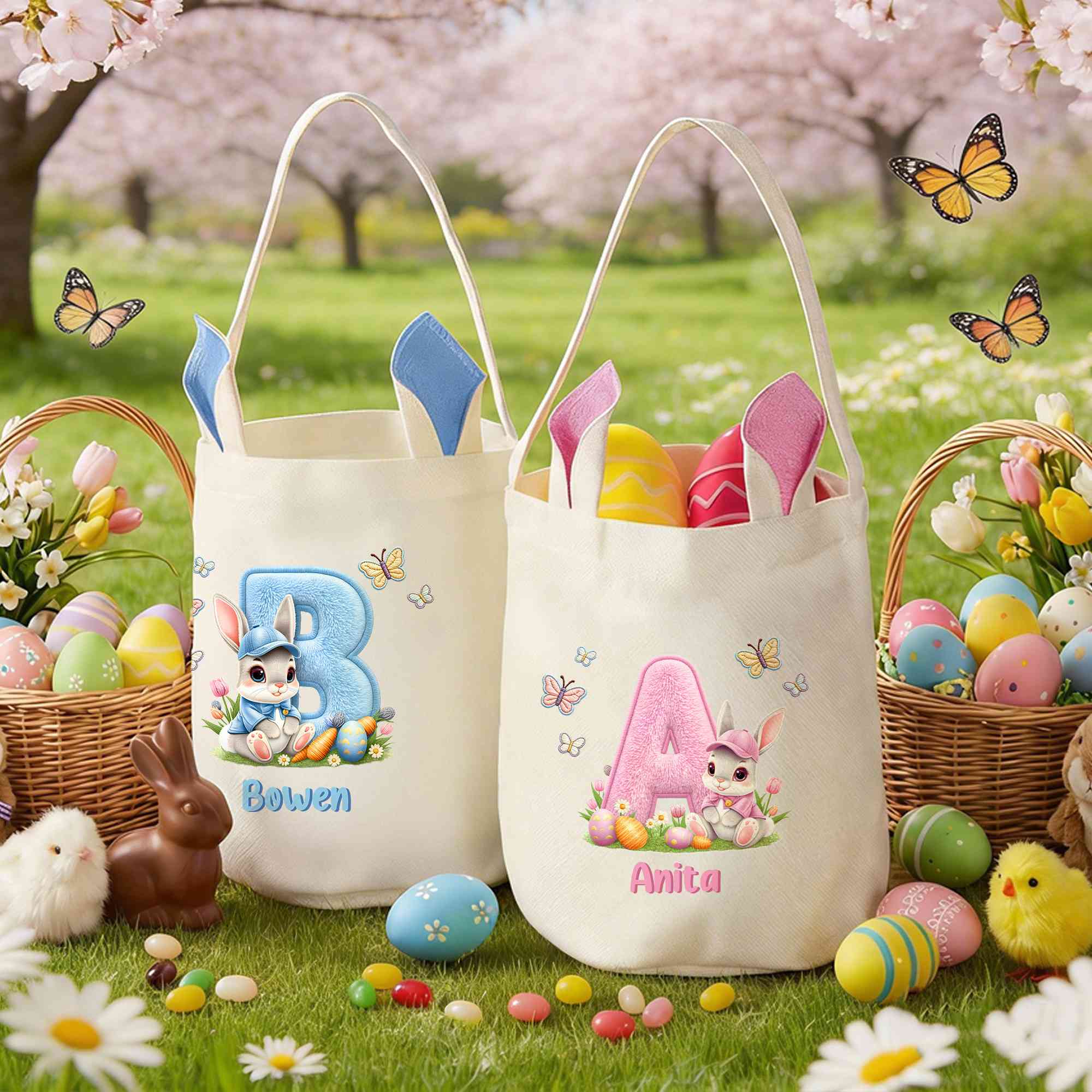 Personalized Name Floral Bunny Alphabet Easter Basket, Large Capacity Cotton Linen Easter Bucket Bag with Bunny Ears, Easter Gift for Kids/Boys/Girls